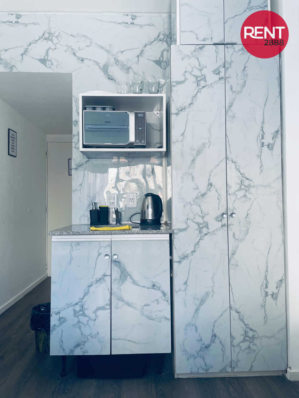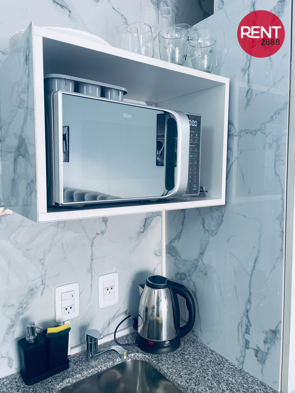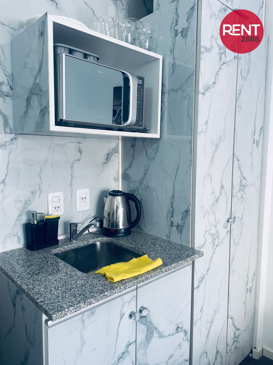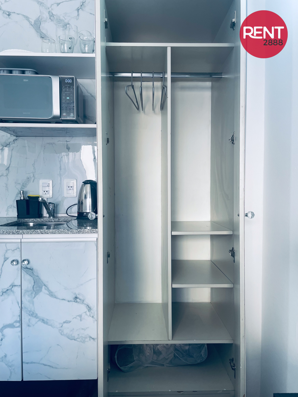 La unidad es compacta pero funcional, con baño privado y un pequeño sector tipo comedor. Está equipada con TV, pava eléctrica y microondas, ideal para resolver comidas simples o desayunos.