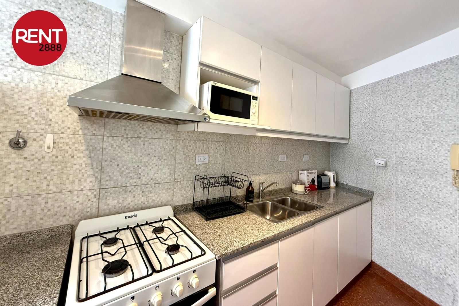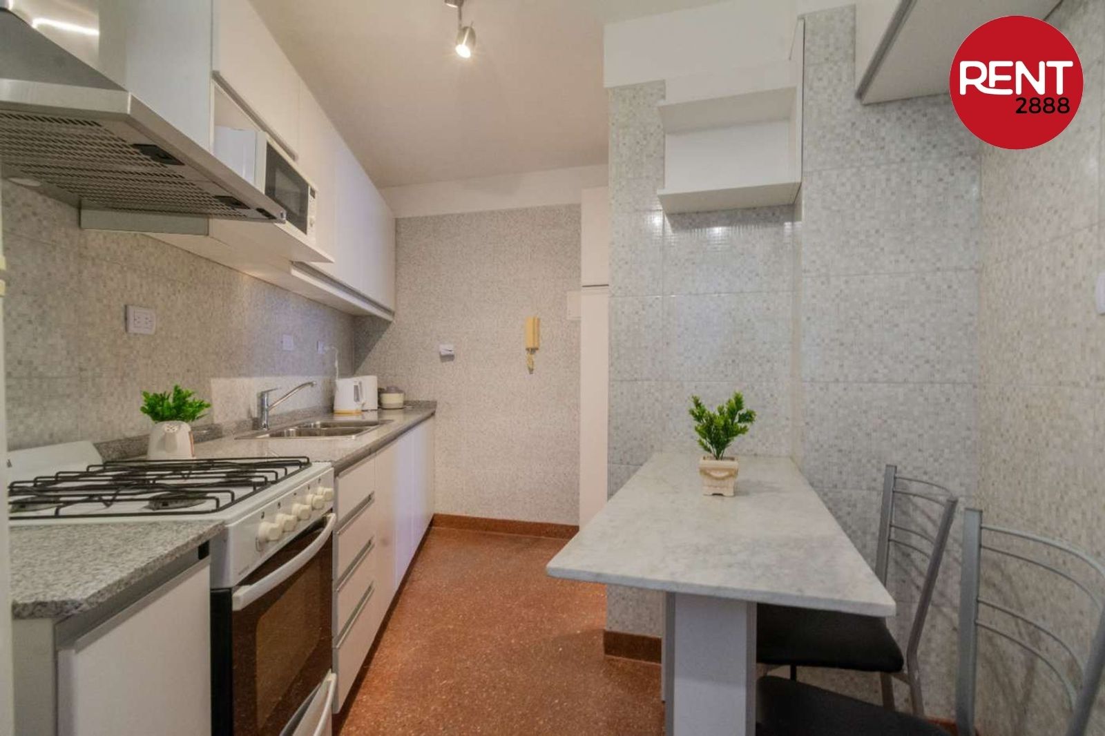 Living con sofá, TV smart y aire acondicionado frío/calor, balcón que aporta constante luz, cocina con horno, microondas, cafetera y lavarropas. Habitaciónes con placard y ventilador.